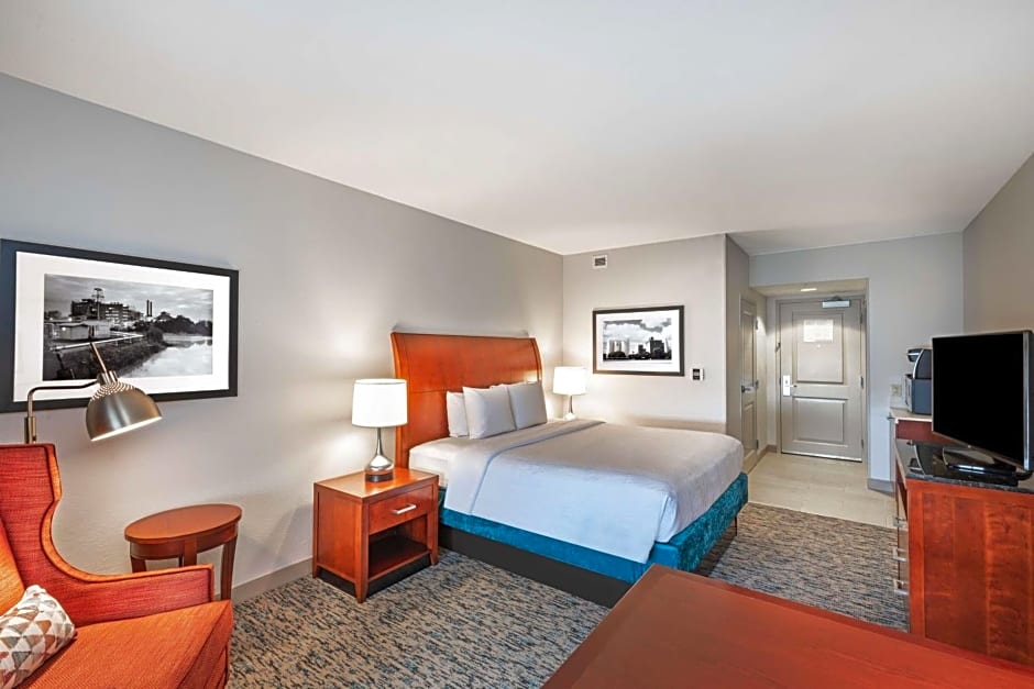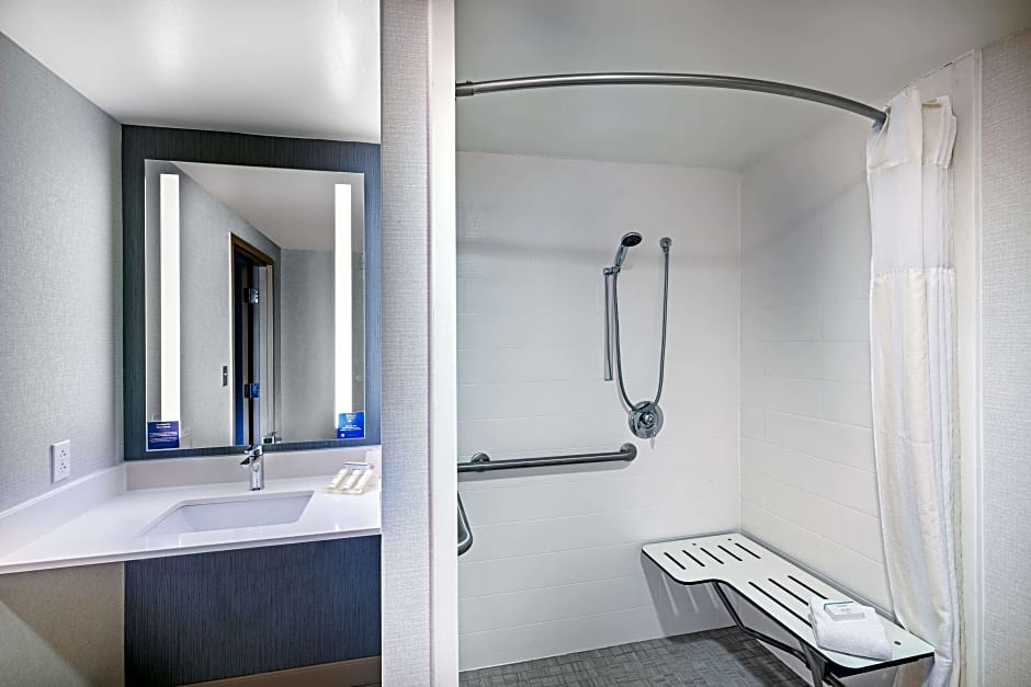 This mobility and hearing accessible hotel room features a king-sized bed, a roll-in shower with attached accessible seating, lowered vanity in bathroom, and lowered closet shelf. The room also has a visual alarm and notification devices for the doorbell or door knock and incoming telephone calls. The ergonomic Mirra chair by Herman Miller is good for your back and better for work. Enjoy your favorite shows on our 32-inch HDTV. There's also a microwave, refrigerator, and coffee/tea maker to help you feel at home. And for conducting business, our rooms ensure your productivity thanks to the complimentary WiFi access, two telephones with dataport and voicemail, and electrical outlets at desk height. Any corresponding photo may not reflect the specific accessible room type or room feature.