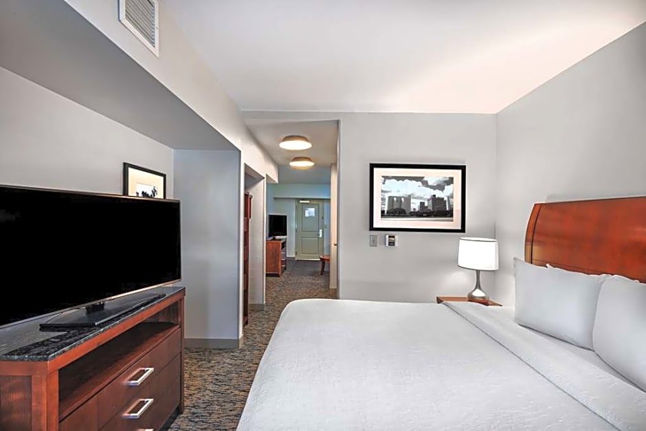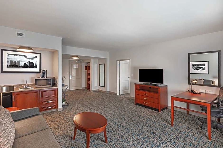 This mobility and hearing accessible one bedroom suite features a king-sized bed, a roll-in shower with attached accessible seating, lowered vanity in bathroom, and lowered closet shelf. The room also has a visual alarm and notification devices for the doorbell or door knock and incoming telephone calls. The ergonomic Mirra chair by Herman Miller is good for your back and better for work. Enjoy your favorite shows on our 32-inch HDTV. There's also a microwave, refrigerator, and coffee/tea maker to help you feel at home. The separate living area has a full-sized sofa bed, coffee table, and HDTV. And for conducting business, our rooms ensure your productivity thanks to the complimentary WiFi access, two telephones with dataport and voicemail, and electrical outlets at desk height. Any corresponding photo may not reflect the specific accessible room type or room feature.